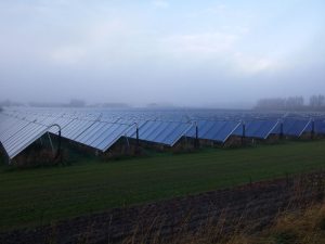I was met at the hotel by my host company for a tour of their factory and district heating plants. EnergyAE has been investigating the implementation of large-scale solar industrial process heating for the Australian climate. We were led to Europe to find the biggest in the world. Denmark has some key factors that have driven the technology. Denmark has little domestic fossil fuels, and the have a long history of centralised heating networks. Solar Thermal using flat plate collectors can often plug directly into their existing thermal infrastructure using the existing storage and fossil based backup plant. The solar field we visited was 15,000m2 of collector area or equivalent to about 10MW of heating on a good day. It produced about 20% of the towns requirement. Each collector is 12.5m2 each and are very neatly laid out using a crane.